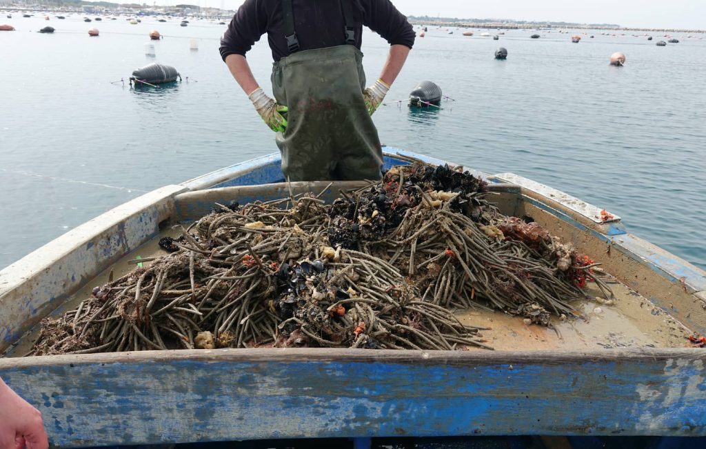Harvest moment: experimental ropes lifted on board at the end of the cultivation cycle, showing numerous large Sabella spallanzanii worms grown within the innovative IMTA developed under the REMEDIALIFE project in Taranto (southern Italy). Photo credit: Adriana Giangrande (University of Salento), coordinator of the REMEDIALIFE project.